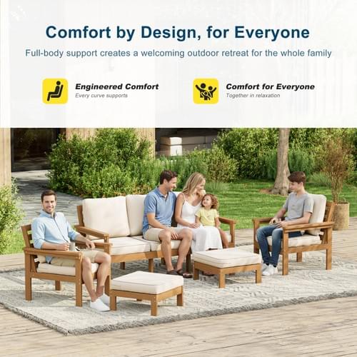 Elevate your backyard with the LIVEWOOD 5-Piece Outdoor Sofa Set, featuring one spacious 3-seat sofa, 2 ergonomic single chairs, and 2 multi-functional ottomans. Crafted from high-impact HIPS material, this patio furniture set is built to endure the elements without warping or cracking. It is the ideal outdoor furniture choice for those seeking long-term durability and comfort in a coordinated outdoor sectional.